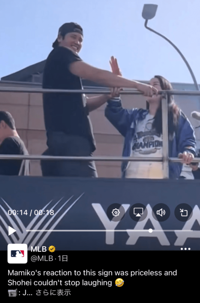 動画では、オープントップバスに乗った大谷夫妻が観客に手を振るなか、ファンの掲げたメッセージを見つけて爆笑。真美子さんは笑いながら大谷の目元を片手で隠す“見ちゃダメ”のしぐさを見せた。MLB公式が投稿したこの映像は、もともとTikTokユーザー・Jaybug2714氏による動画を転載したもので、現地ファンによる投稿が発端となっている。