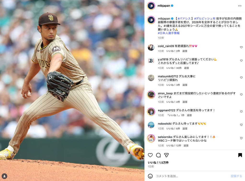 この投稿には、Instagramユーザーから「ダルさんリハビリ頑張ってください これからもずっと応援してます」「とても残念だけど、しっかり治して万全の姿をマウンドで見られるように願い祈っています」「40歳代なのに155キロ連発するのが怪物すぎる」「絶対に復活してください。2027年、絶対に圧倒的な投球を見せてくれると信じています」といった声が寄せられている。