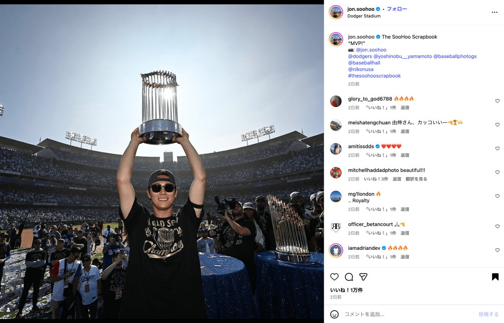 この投稿には、Instagramユーザーから「由伸さん、カッコいいー」「スーホーさん1年間とてもたくさんの感動と投稿ありがとうございました」「ヨシ本当最高だよ」「由伸がトロフィーを掲げるこの笑顔は ドジャースの素晴らしいチームワークを物語っていますね」といった称賛と喜びの声が寄せられている。