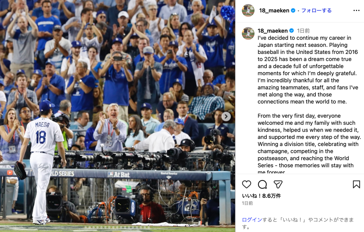 前田は「I’ve decided to continue my career in Japan starting next season.」と切り出し、日本球界に復帰することと、アメリカでの10年間のキャリアを振り返り、ファンや関係者への感謝を全文英語で伝えた。そのほか、前田がロサンゼルス・ドジャース、ミネソタ・ツインズ、デトロイト・タイガースなど歴代所属のユニフォームを着用した写真なども投稿された。