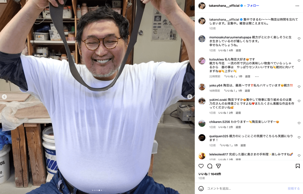 投稿写真では、白いTシャツ姿の貴乃花さんが、両手でひも状の粘土を持ち上げながら満面の笑みを浮かべている。工房の棚には陶芸道具が並び、作業の合間に見せた楽しげな表情が印象的だ。コメント欄には「陶芸は時間を忘れてしまいます。全集中。雑音は聞こえません」の言葉通り、日常を忘れて創作に没頭する様子が伝わってくる。