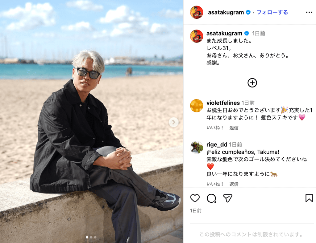 「また成長しました。レベル31。お母さん、お父さん、ありがとう。感謝。」と投稿されたのは、海辺に腰掛けてほほ笑む浅野の姿。全身黒のモノトーンコーデにサングラスをかけ、銀髪がスタイリッシュにきまっている。浅野は11月10日に31歳の誕生日を迎えた。