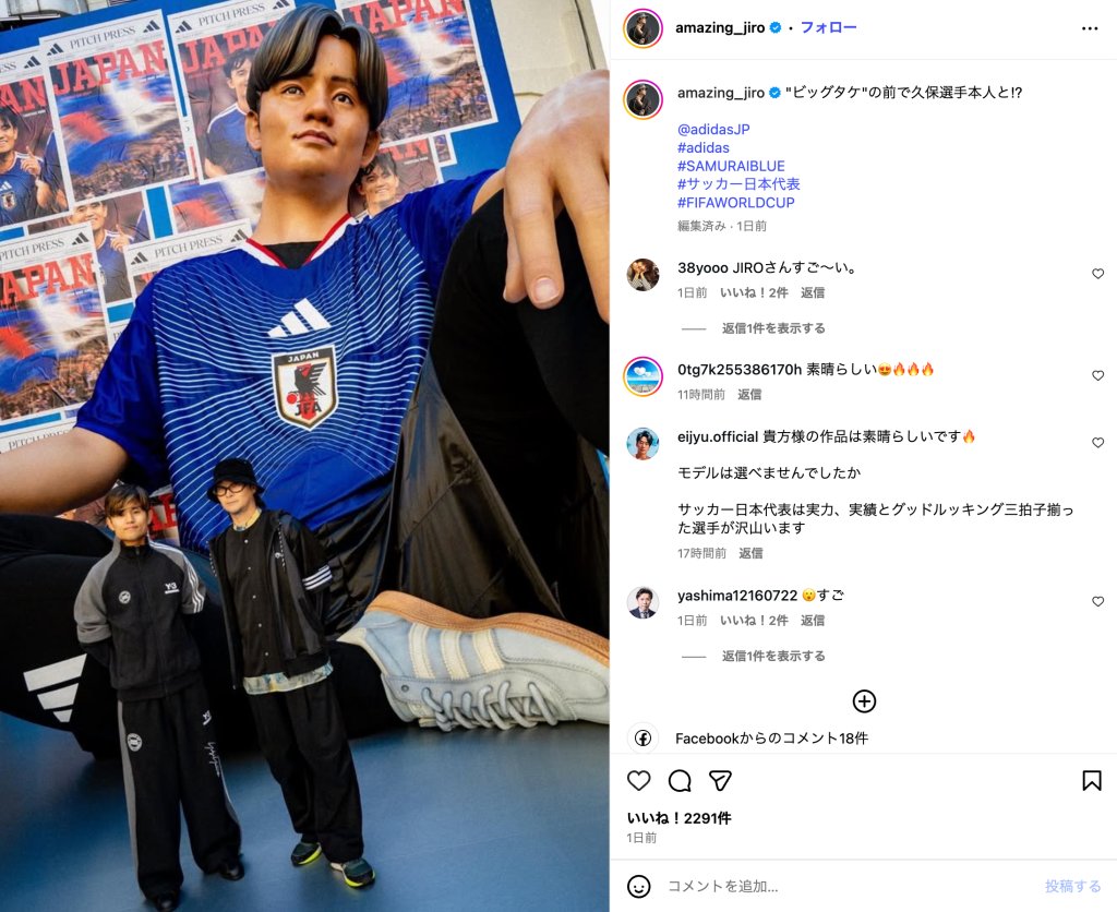 投稿では、日本代表ユニホームを着用した巨大モニュメント「ビッグタケ」の足元に、久保とJIRO氏が並ぶ様子も紹介されている。対比によってモニュメントの規格外の大きさが際立ち、まるでフィギュアの世界に迷い込んだかのようなスケール感が伝わる。背後には「JAPAN」と記された号外風のポスターが並び、イベント空間の高揚感が画面いっぱいに広がっている。