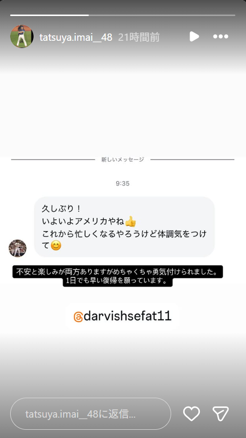 埼玉西武ライオンズの今井達也(27)が11月12日、Instagramストーリーズを更新。ダルビッシュ有(39)から寄せられたメッセージを公開した。