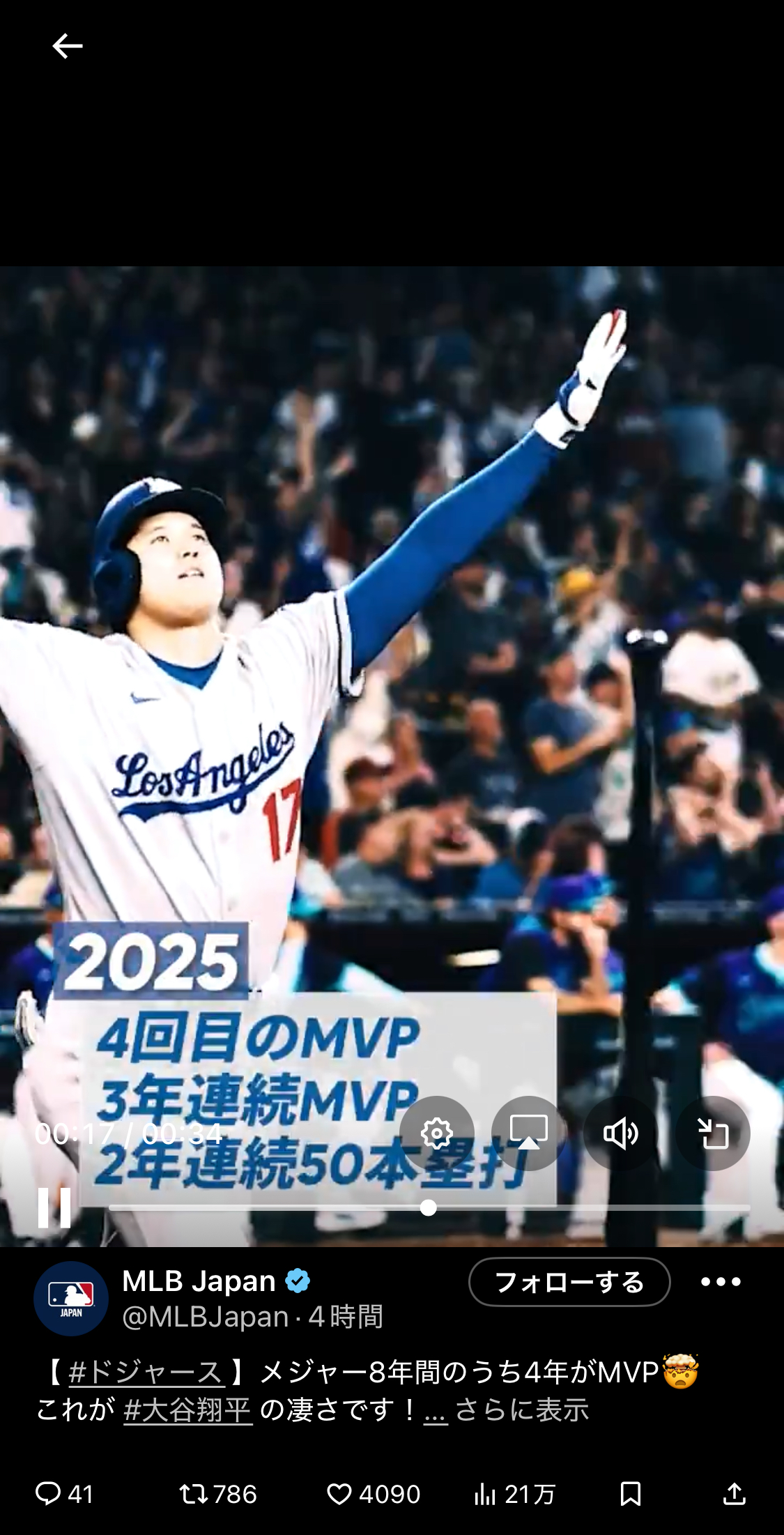 大谷翔平、メジャー8年間で“3年連続4回目”MVP選出 圧巻記録に「ただの伝説」「今日は祝日に」