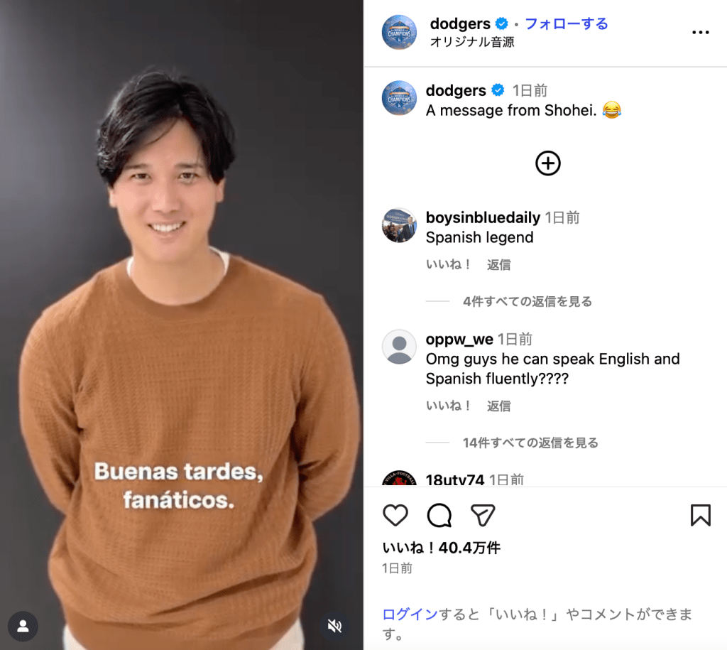 「A message from Shohei.」と投稿されたのは、ブラウンのニットに身を包んだ私服姿の大谷がカメラに向かってメッセージを送る動画。大谷は「Buenas tardes, fanaticos」と流暢なスペイン語であいさつし、「I appreciate your support.」「Thank you.」と笑顔でファンに感謝を伝えた。