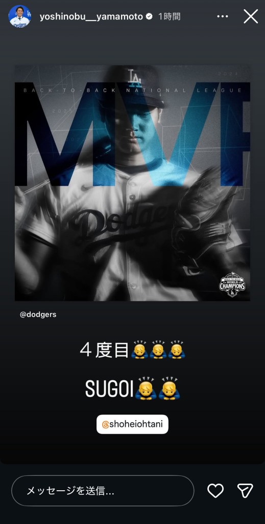 投稿されたのは、ドジャースのInstagramから引用した大谷のMVP受賞を称える画像。山本は絵文字をつけつつ「4度目」「SUGOI」と先輩である大谷の偉業を祝福した。大谷のMVP受賞は3年連続4度目となる。