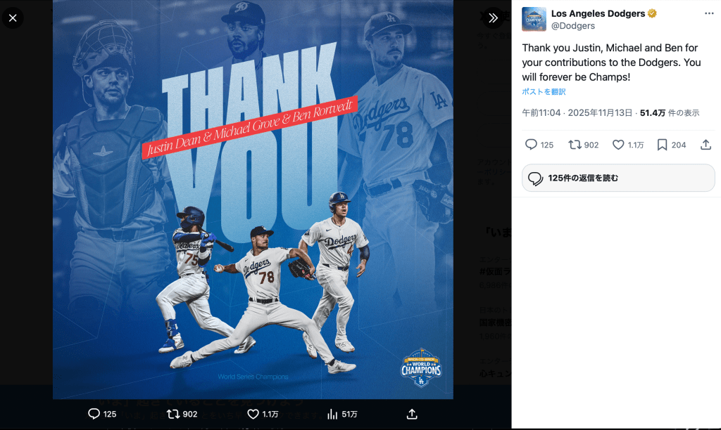 「Thank you Justin, Michael and Ben for your contributions to the Dodgers. You will forever be Champs!」と投稿されたのは、「Thank you」とロートベット、ディーン、グローブ3名を送り出す画像。ロートベットは山本由伸(27)ともバッテリーを組み、攻守ともに貢献していた。