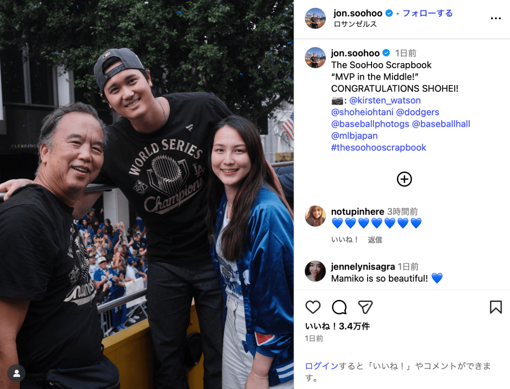 「The SooHoo Scrapbook “MVP in the Middle!” CONGRATULATIONS SHOHEI!」と公開されたのは、ドジャースの優勝パレードのときの写真。Tシャツを着た大谷と、スタジアムジャンパーを着た真美子夫人、スーフー氏3名の笑顔の集合写真を投稿した。