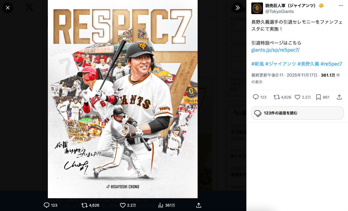 読売ジャイアンツが11月17日、Xを更新。長野久義(40)の引退セレモニーの開催を発表した。