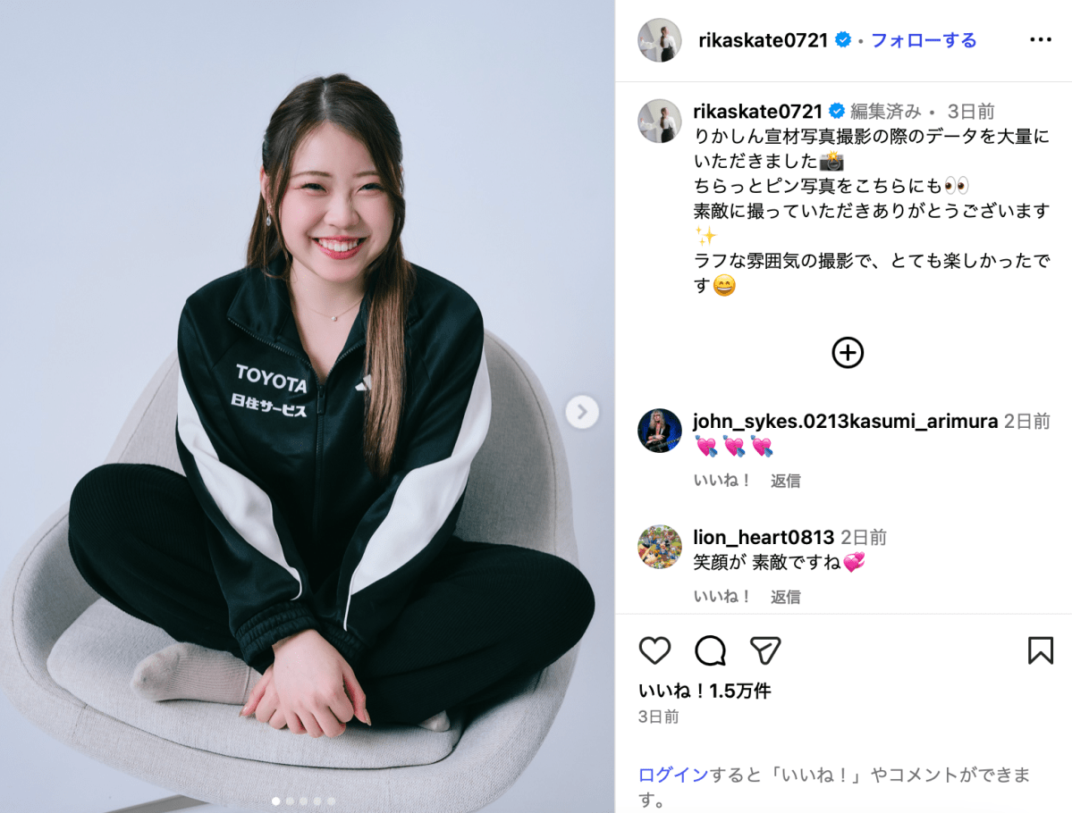 「りかしん宣材写真撮影の際のデータを大量にいただきました」と投稿されたのは、胸に「TOYOTA 日住サービス」と描かれたジャージを着た紀平の写真。椅子の上であぐらをかいて笑顔を見せている。紀平は「ちらっとピン写真をこちらにも 素敵に撮っていただきありがとうございます ラフな雰囲気の撮影で、とても楽しかったです」と締めくくった。
