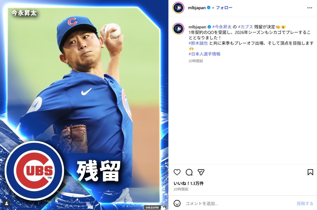 MLB Japanは11月19日、公式Instagramを更新。シカゴ・カブスからFAになった今永昇太(32)が残留することを報告した。