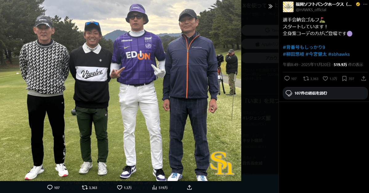 福岡ソフトバンクホークスは11月20日、公式Xを更新。選手会で行われた納会ゴルフの写真を公開し、柳田悠岐(37)の服装にファンからツッコミが相次いでいる。