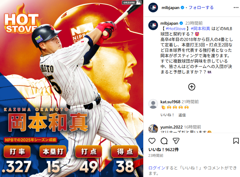 MLBは11月21日、日本公式Instagramを更新。米リーグへ挑戦する岡本和真(29)のビジュアルを公開した。「岡本和真はどのMLB球団と契約する?」という問いかけに、ファンの移籍先予想が白熱している。