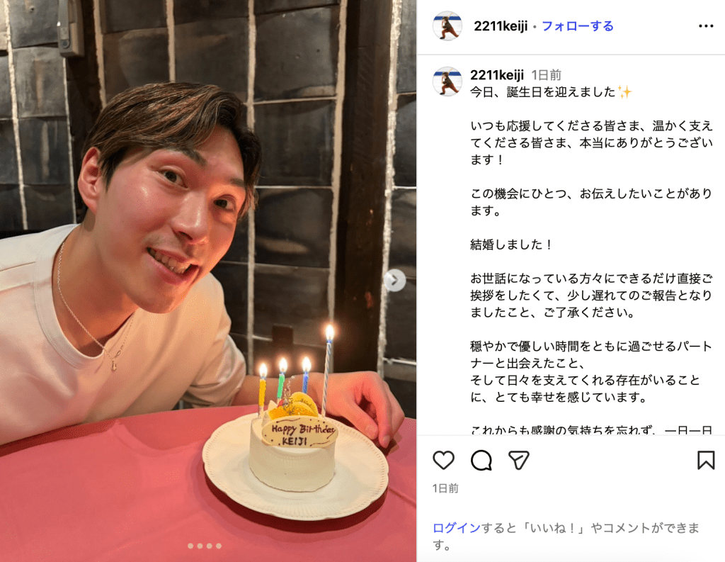 「今日、誕生日を迎えました」と投稿されたのは、誕生日ケーキの横で笑顔を浮かべる田中の写真。田中は11月21日で31歳を迎えた。田中は「この機会にひとつ、お伝えしたいことがあります」と前置きし、「結婚しました! お世話になっている方々にできるだけ直接ご挨拶をしたくて、少し遅れてのご報告となりましたこと、ご了承ください。」と結婚を報告した。