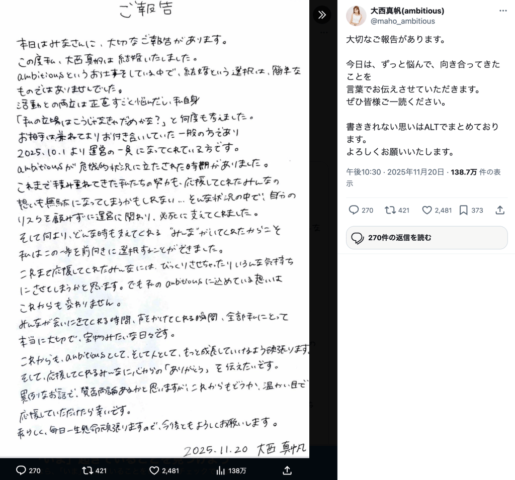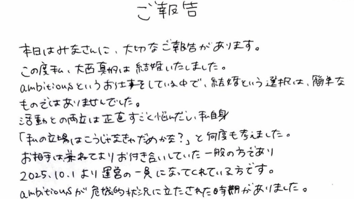 北海道のガールズグループ「ambitious」で活動する元ファイターズガールの大西真帆(30)が11月20日、自身のXを更新し、グループ運営の一員である一般男性との結婚を発表した。投稿には直筆メッセージを掲載し、活動との両立に悩みながらも決意に至った思いを丁寧につづった内容となっている。