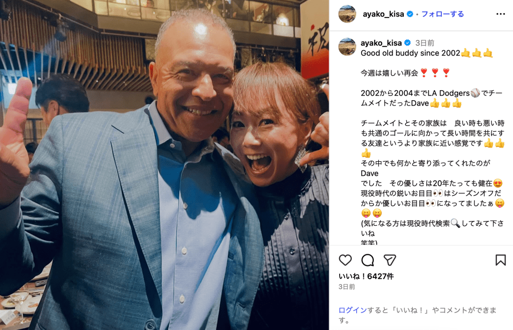 この投稿にはInstagramユーザーから「素晴らしい再会ですね!」「あのロバーツ監督と…木佐さん、すごっ!」「わぁーロバーツ監督さんは貫禄ですね」「旦那様もドジャースメンバー」といったコメントが寄せられた。