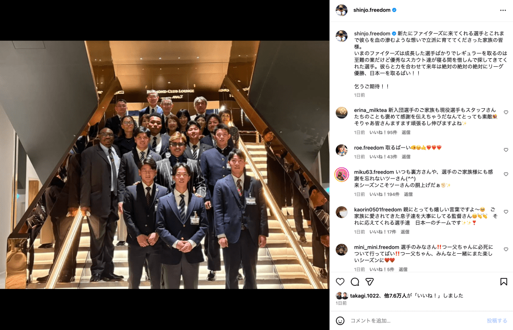 公開された画像には、ホテルのラウンジ階段に並んだ新入団選手と家族、球団関係者の姿が写されている。スーツ姿の若い選手たちの表情は引き締まり、上段には保護者の笑顔も並ぶ。新庄監督は中央に立ち、全員がライトに照らされた華やかな空間で、新たな門出の瞬間を共有している。