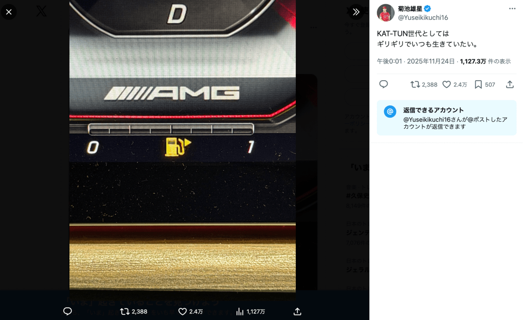 菊池はガソリン切れが近いガソリンメーターの写真をアップし「KAT-TUN世代としてはギリギリでいつも生きていたい」とアイドルグループKAT-TUNの「Real Face」のフレーズをつぶやいた。