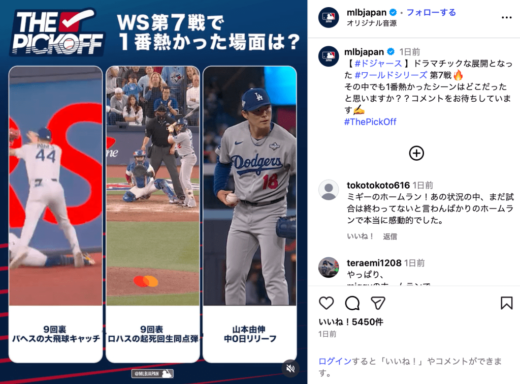 MLB Japanが11月24日、Instagramを更新。「WS第7戦で1番熱かった場面は?」と動画を公開した。