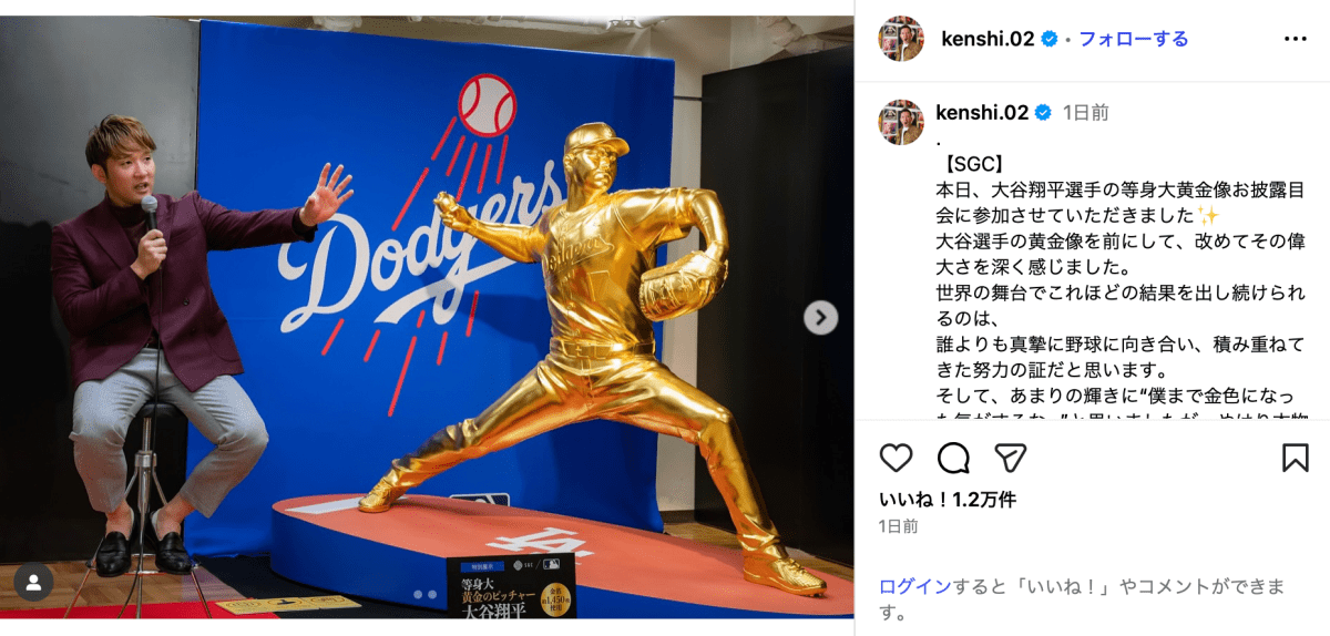 この投稿にはInstagramユーザーから「拳士さんも、輝いて下さい」「稼ぎまくって自分で純金像建てたれ」「拳士さんのコミュニケーション能力はマジでメジャーMVPレベルだと思いますよ」「あまり謙遜なさらないで下さい」といったコメントが寄せられた。