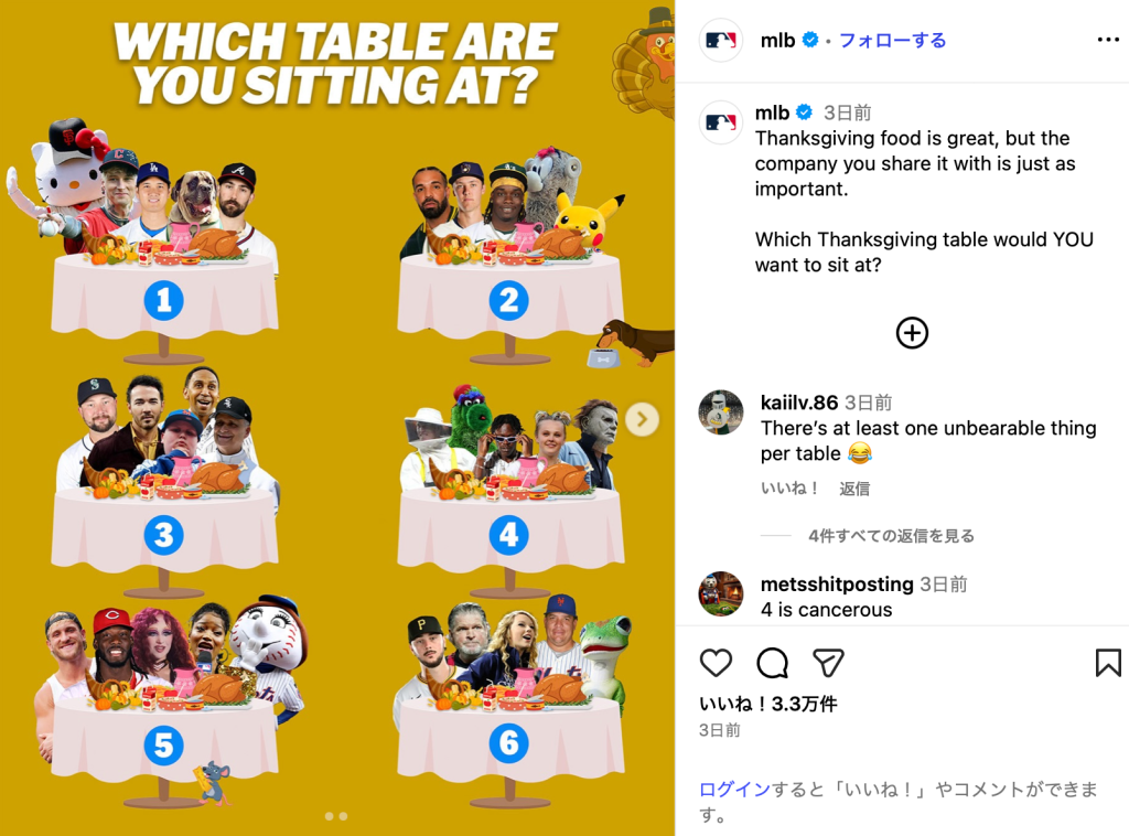 MLBが11月27日、Instagramを更新。「Which Thanksgiving table would YOU want to sit at?」(どの感謝祭のテーブルに座りたい?)とコメントを呼びかけた。