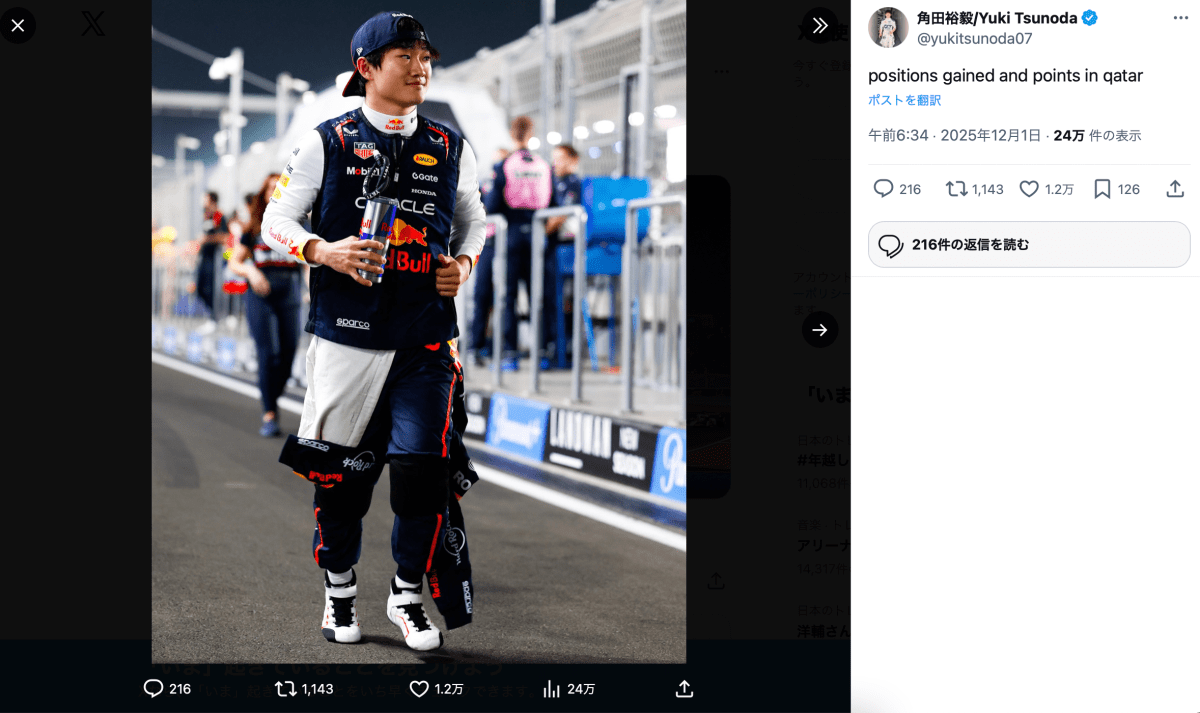 F1レーサーの角田裕毅(25)が12月1日、Xを更新。F1第23戦カタールGP決勝の結果を振り返った。