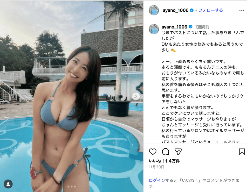 この投稿にはInstagramユーザーから「あやのさんのバストは本当に日本一美しい」「美しさの裏には大変な苦労がありますね」「爆弾級バストで大変ですね」「ケアして美しさをいつまでも」「バスト大きい方の悩みもいろいろあるんですね」とねぎらいのコメントが寄せられた。
