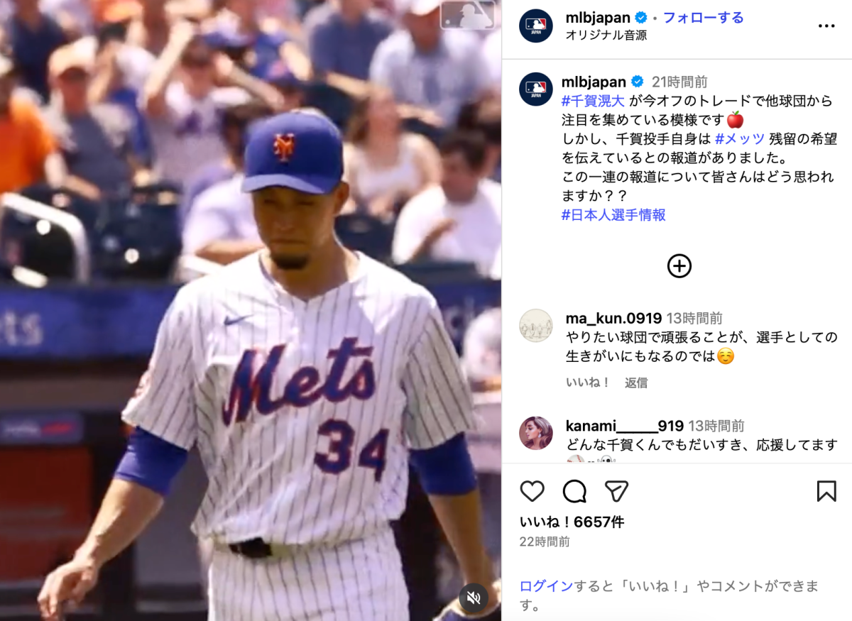 MLB Japanは「#千賀滉大 が今オフのトレードで他球団から注目を集めている模様です」とつづり、「しかし、千賀投手自身は #メッツ 残留の希望を伝えているとの報道がありました」と千賀の状況を伝えた。そして最後に「この一連の報道について皆さんはどう思われますか??」と呼びかけた。