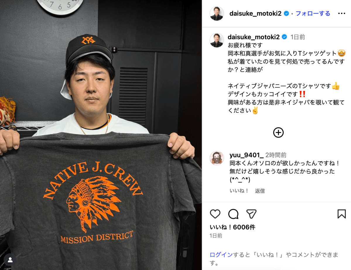 「お疲れ様です 岡本和真選手がお気に入りTシャツゲット」と投稿されたのは、Tシャツを持ってほほ笑む岡本の姿。元木は「私が着ていたのを見て何処で売ってるんですか?と連絡が」と経緯について説明した。Tシャツはファッションブランド「Native Japanese」のもの。