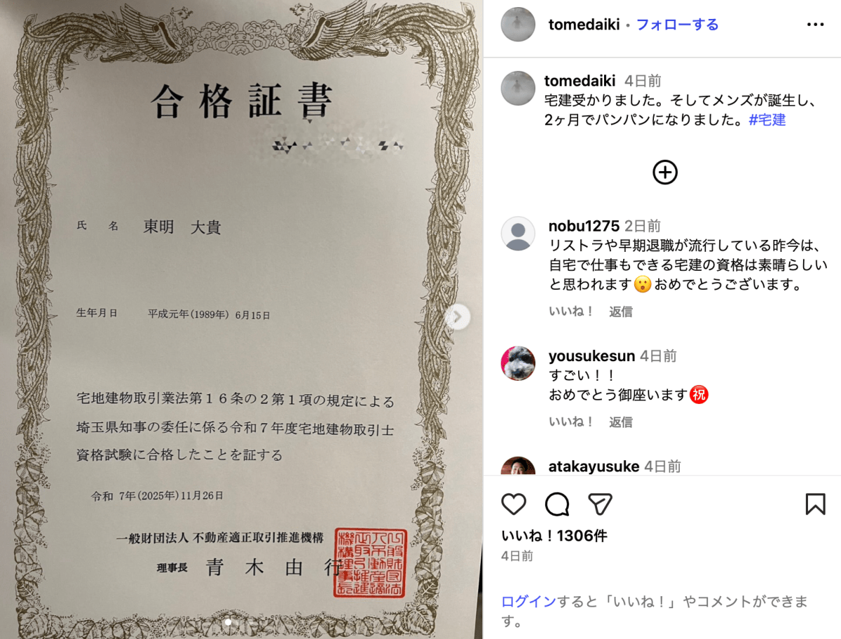 この投稿にはInstagramユーザーから「坊ちゃんも生まれて、ますます頑張らなきゃですね」「宅建すごい」「努力家でほんと尊敬します…!!」「ダブルでおめでとうございます」といった声が寄せられた。