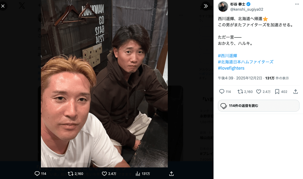 「西川遥輝、北海道へ帰還 この男がまたファイターズを加速させる」と投稿されたのは、杉谷と口元をきゅっとすぼめた西川のツーショット。西川は東京ヤクルトスワローズから戦力外通告を受け、5年ぶりに北海道日本ハムファイターズに復帰した。杉谷は「ただ一言——おかえり、ハルキ」としみじみと祝福の言葉を送った。