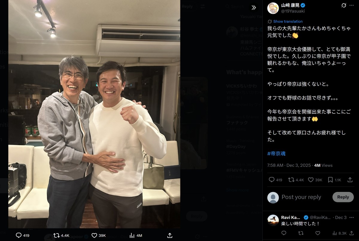 横浜DeNAベイスターズの山﨑康晃(33)は12月3日、X(旧Twitter)を更新。母校・帝京高出身のメンバーが集まる「帝京会」が開催されたことを報告した。