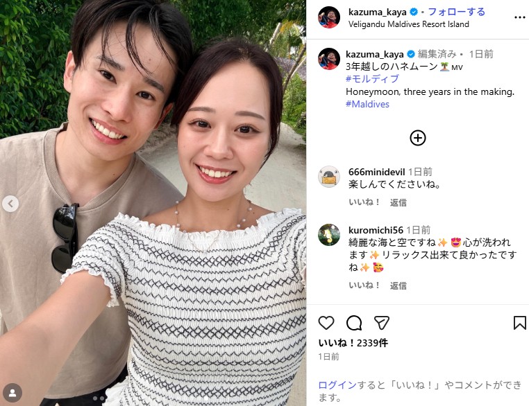 「3年越しのハネムーン」というコメントと共に投稿された写真は、モルディブを訪れた萱と妻の自撮り2ショット。Tシャツの胸元にサングラスをかけた萱は、妻に寄り添い、白い歯を見せた笑顔を浮かべている。