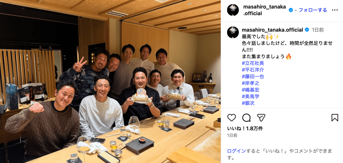 「最高でした」と投稿されたのは、田中が平石洋介(45)、藤田一也(43)、岸孝之(41)、岡島豪郎(36)らと食事を楽しむ様子。田中は「将大200勝おめでとう」と日米通算200勝を祝うメッセージが書かれたケーキを持ってほほ笑んでいる。田中は「色々話しましたけど、時間が全然足りません!!!!また集まりましょう」と締めくくった。