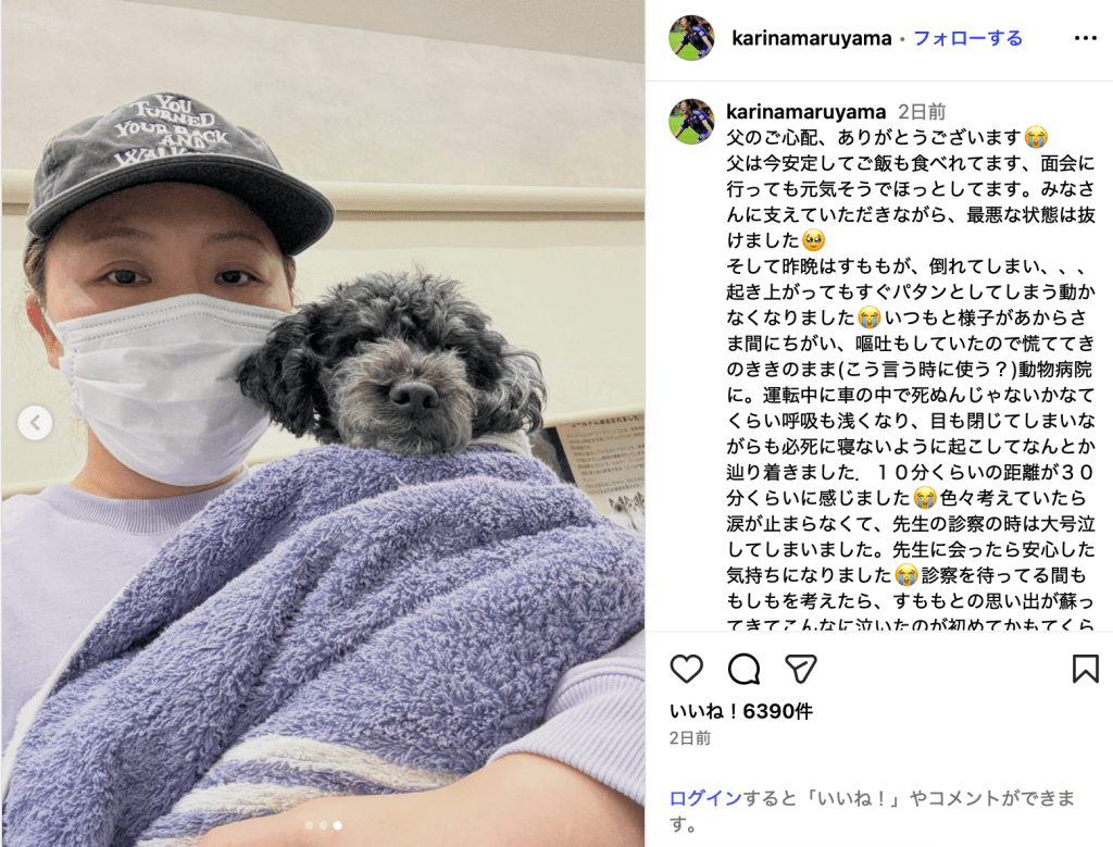 丸山は「父のご心配、ありがとうございます」と、2日に父親が救急搬送されたことに触れ、「父は今安定してご飯も食べれてます」と無事を報告。そして「そして昨晩はすももが、倒れてしまい、、、起き上がってもすぐパタンとしてしまう動かなくなりました」と愛犬の体調不良について伝えた。