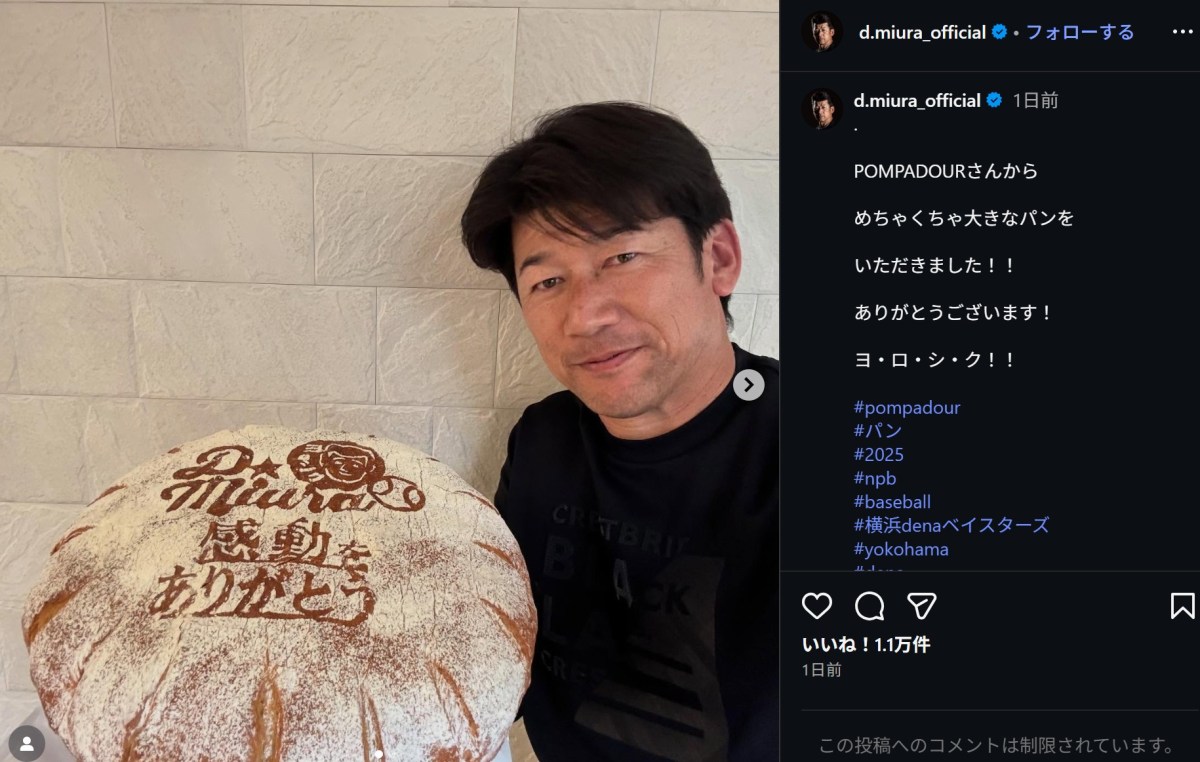 「POMPADOURさんから めちゃくちゃ大きなパンを いただきました!!」というコメントと共に投稿された写真は、大きなパンと並んだ三浦のソロショットだ。パンには、三浦の似顔絵と、「感動をありがとう」という言葉がデコレーションされており、ハマの番長への特製の贈り物であることがみてとれる。