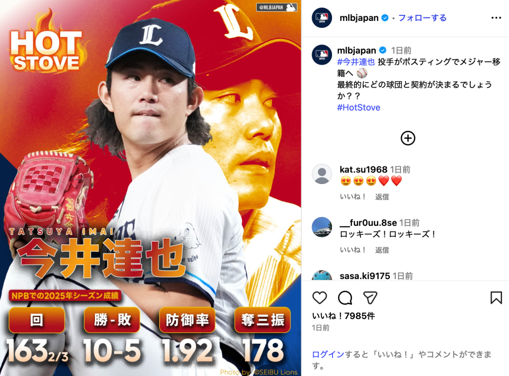 今井は、11月10日にポスティングシステムを使用してMLBへの移籍を目指す意向を示したことが球団Webサイトで公表された。MLB Japanは「#今井達也 投手がポスティングでメジャー移籍へ 最終的にどの球団と契約が決まるでしょうか?? #HotStove」と締めくくった。画像によると今井の2025年シーズン成績は、163回(2/3)投げ、10勝5敗、防御率は1.92、奪三振は178。