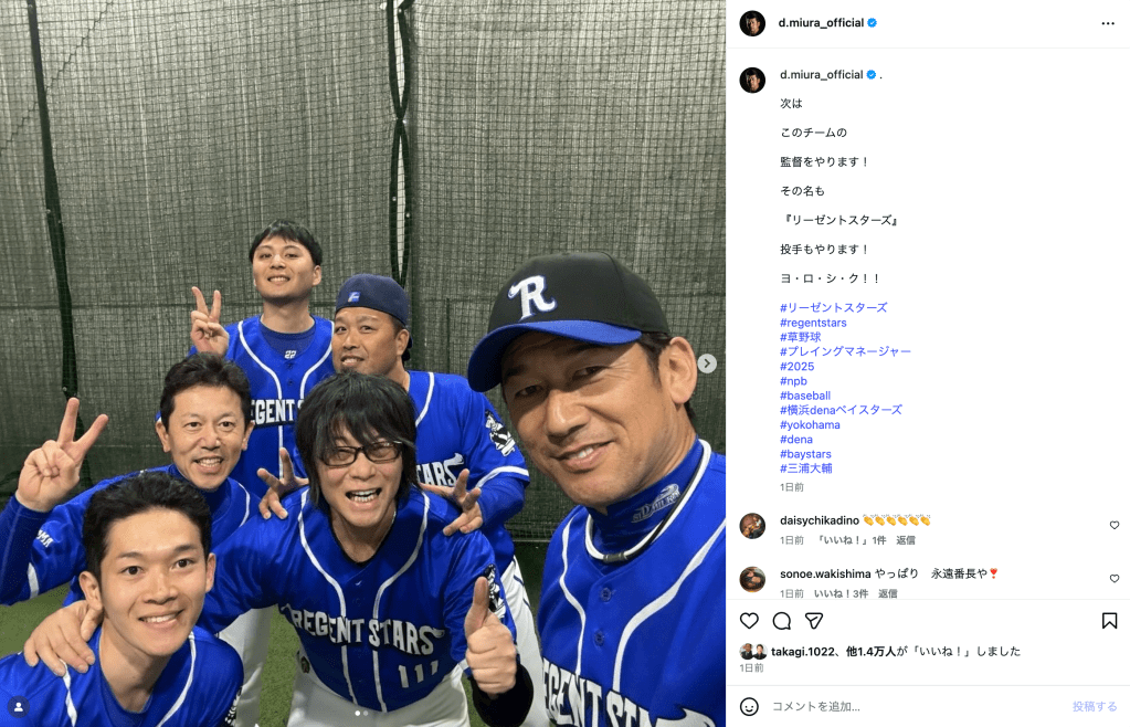 DeNA前監督の三浦大輔(51)が12月8日、公式Instagramを更新し、「次はこのチームの監督をやります!」と報告した。投稿では、草野球チーム「リーゼントスターズ」の指揮を執ることに加え、投手も務める“プレイングマネジャー”として参加することを紹介。背番号「18」の青いユニホームを着用し、新たな野球人生への意気込みを示している。