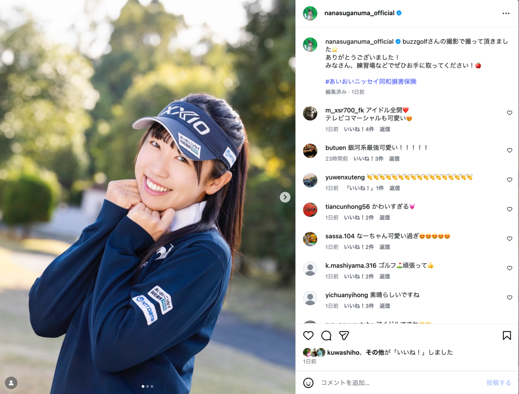 この投稿には、Instagramユーザーから「銀河系最強可愛い!!!!!」「なーちゃん可愛い過ぎ」「アイドル全開 テレビコマーシャルも可愛い」「なーちゃんはホントにゴルファーなの? どう見てもアイドルだよな」といった称賛の声が寄せられている。