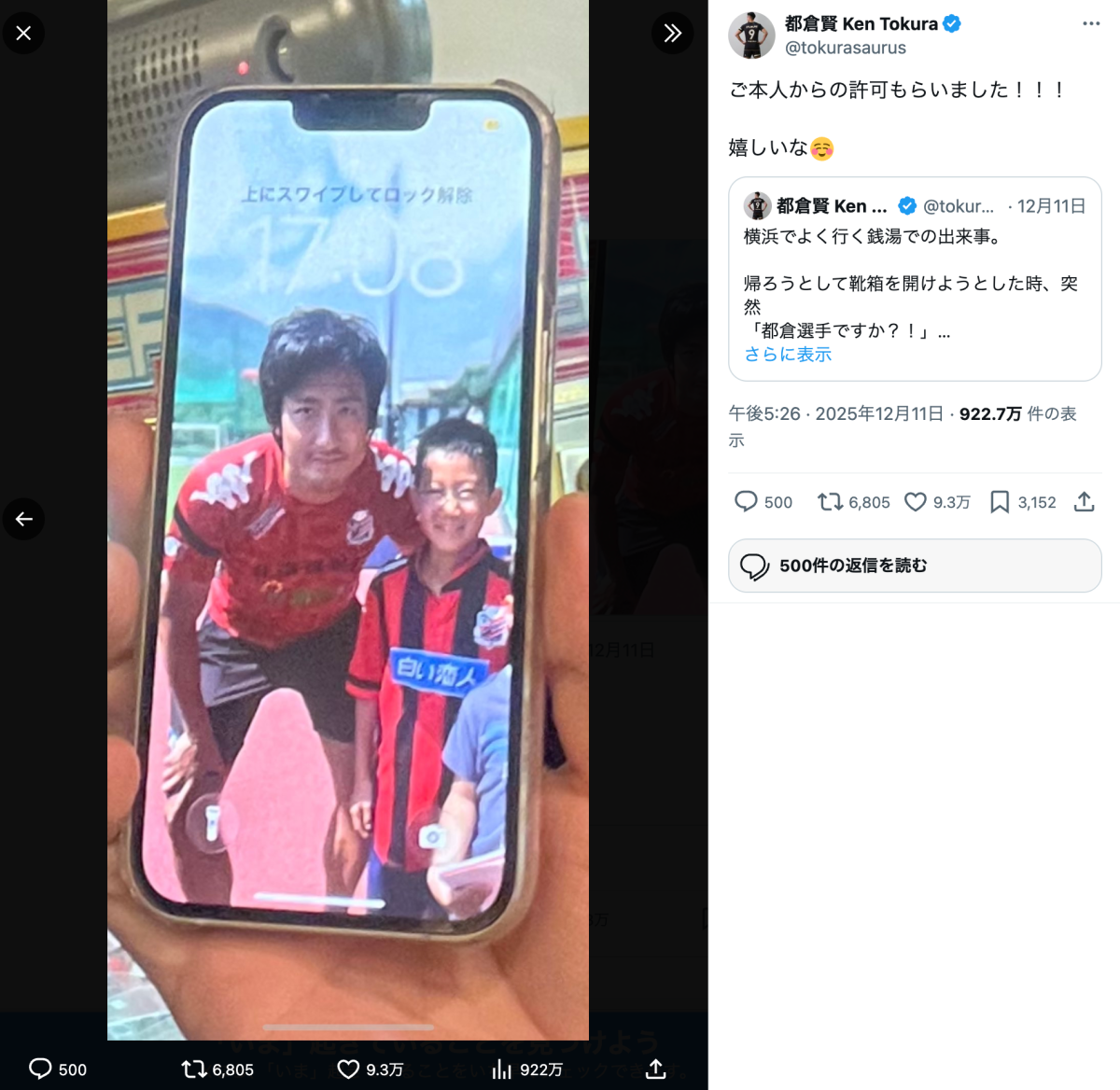 見知らぬ男性から「都倉選手ですか?」と声をかけられた都倉。さらに「コンサ時代から応援してます」と打ち明けられ、男性はおもむろにスマートフォンを取り出した。その待ち受け画面に映っていたのは、約10年前、北海道コンサドーレ札幌の練習場で撮影した都倉とのツーショット写真。大学進学で神奈川に移り住み、ずっと気になっていたという銭湯に初めて訪れたその日に、偶然にも本人と出会ったという。都倉はこの出来事を「偶然では片づけにくい、温かい奇跡のような瞬間」と表現し、10年以上前の一枚を今も大切にしてくれていたことに、胸が熱くなったとつづっている。