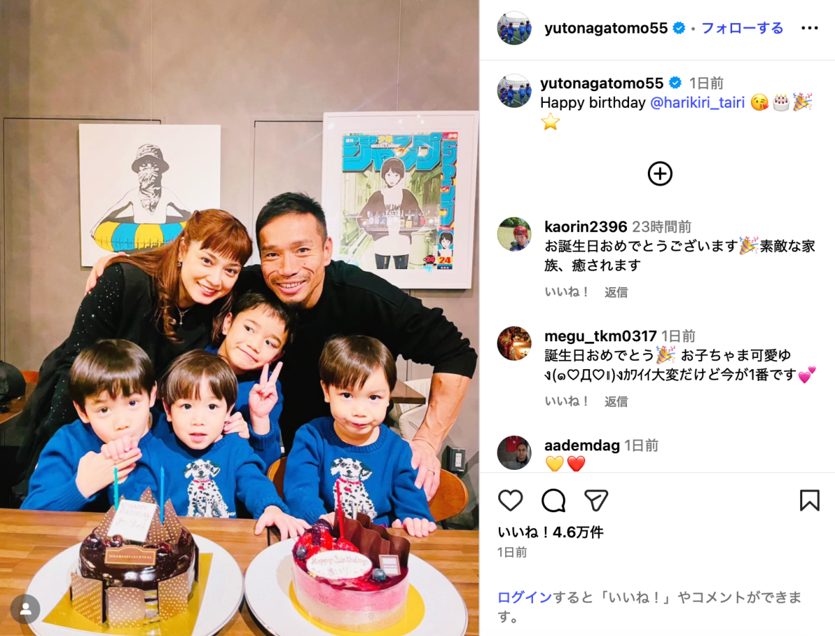 「Happy birthday」と投稿されたのは、長友と平と、お揃いのセーターを着た子どもたち4人の家族写真。机の上にはケーキが2つ用意されており、誕生日を祝うメッセージプレートが飾られている。平は12月12日で41歳の誕生日を迎えた。