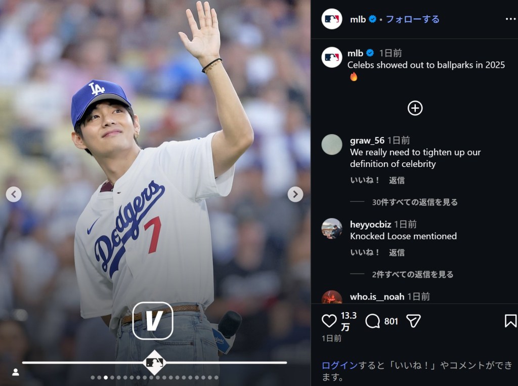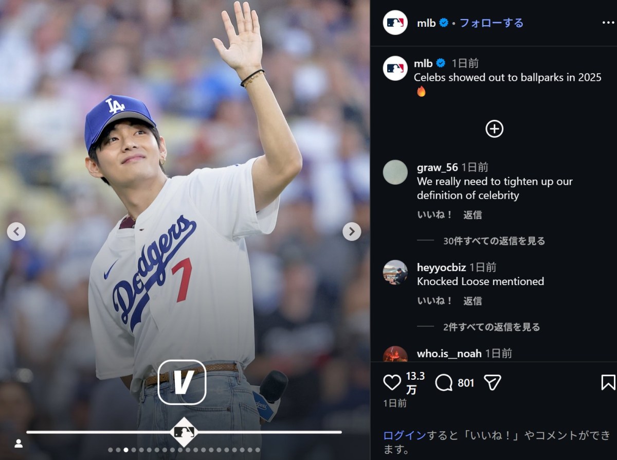 投稿された写真は、BTSのV(29)のソロショット。ドジャースのキャップとユニホームにブルーのデニムを着用しており、大勢の観客をバックに爽やかな笑みを浮かべている。Vは、2025年8月にドジャースタジアムで始球式を務めており、大谷翔平(31)とのベンチでのハグや、キム・へソン(26)とのビデオ通話での交流が大きな話題になっていた。