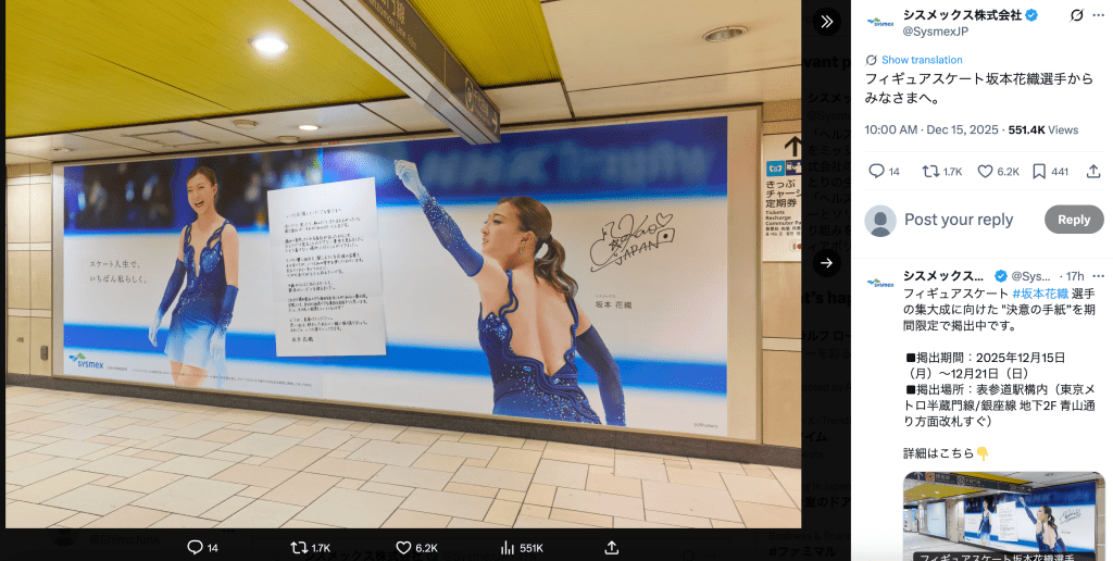 【画像】表参道駅に掲出された坂本花織の“決意の手紙”(画像はシスメックス株式会社Instagramより引用)