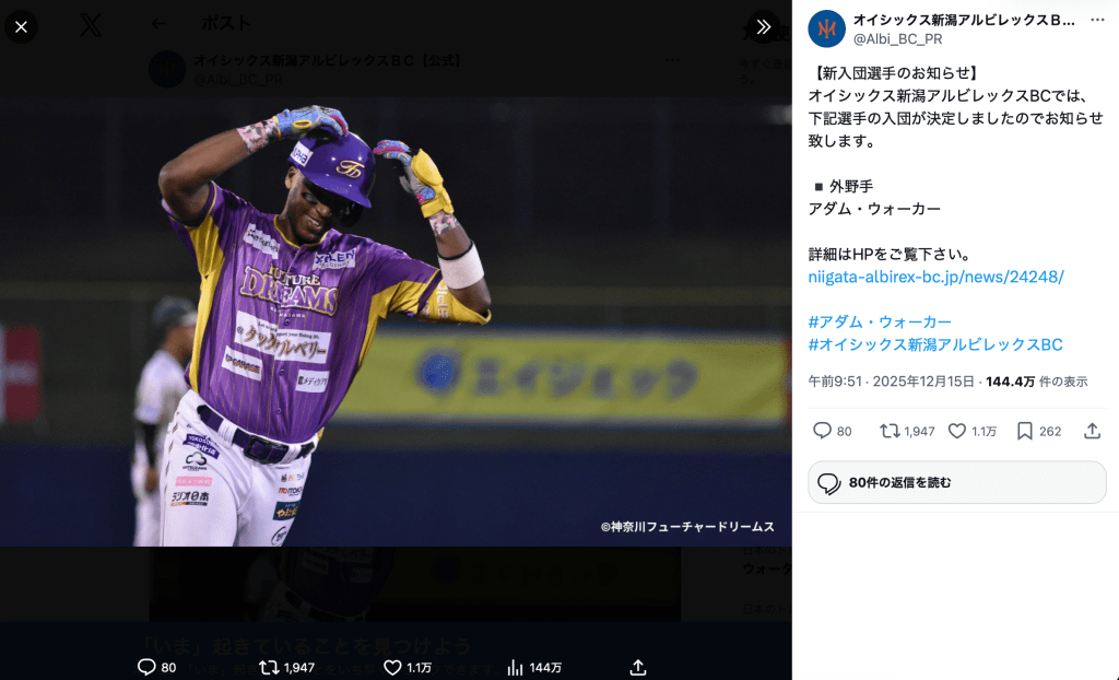 オイシックス新潟アルビレックスBCが12月15日、Xを更新。読売ジャイアンツなどでプレーしたアダム・ウォーカー(34)が入団することを発表した。