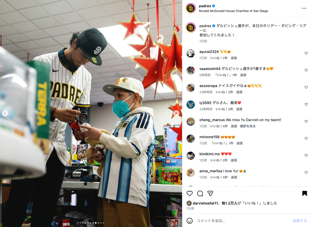 MLBサンディエゴ・パドレスのダルビッシュ有(39)が、ホリデーシーズン恒例の「ホリデー・ギビング・ツアー」に参加した。パドレス公式Instagramが12月16日にその様子を公開し、子供たちと触れ合う姿に温かな反響が広がっている。訪問先は、病気と闘う子供や家族を支援する施設「Ronald McDonald House」。投稿では、ダルビッシュが子供たちと時間を過ごす様子が写真や動画で紹介された。