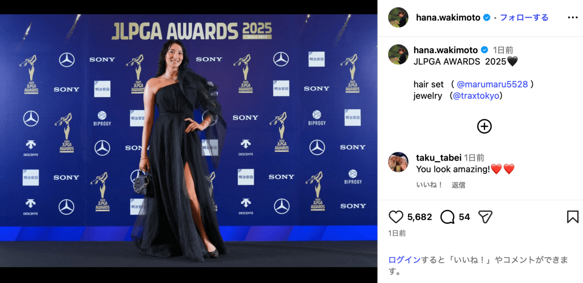 女子プロゴルファーの脇元華(28)が12月16日、Instagramを更新。日本女子プロゴルフ協会が開催した年間表彰式「JLPGAアワード2025」での近影を公開した。