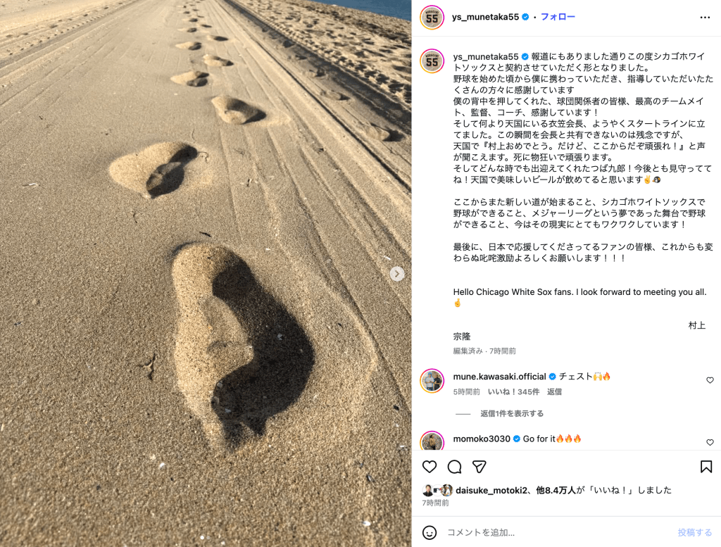 村上宗隆、ホワイトソックス入団を報告 「ヤクルトファンはずっと味方」の声殺到…足跡の写真に決意込める