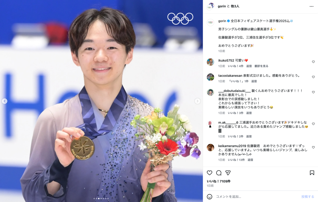 この投稿には、Instagramユーザーから「駿くんおめでとうございます! 本当に最高でした! 表彰台での涙感動しました! これからも頑張って下さい!」「五輪出場を決めて、それでも演技に満足出来なくて大泣きしている姿を見て、こちらももらい泣きしてしまいました」「三浦選手おめでとうございます ドキドキしながら応援してました」「3人揃っての表彰台! ミラノ五輪代表おめでとうございます!」といった声もあり、全日本の舞台を称える反応が広がっている。