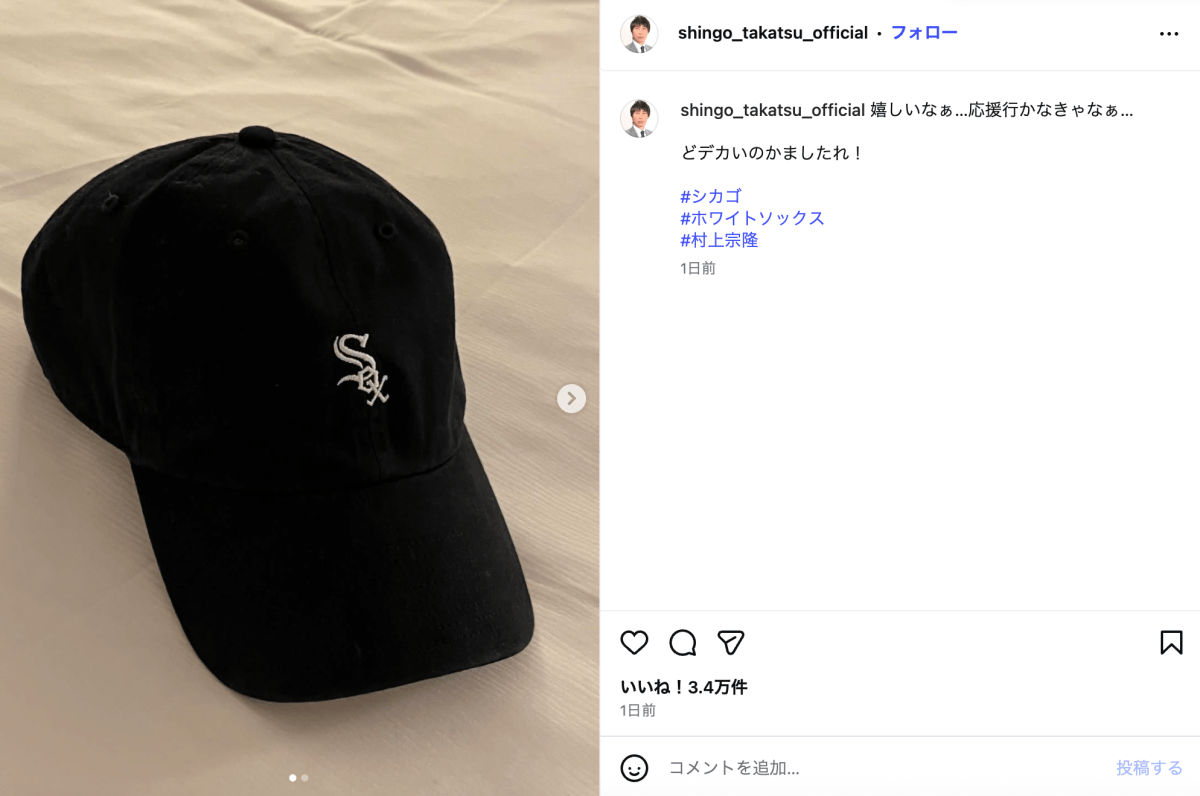 「嬉しいなぁ…応援行かなきゃなぁ…」とのコメントとともに公開されたのは、ホワイトソックスのロゴマークが描かれた黒いキャップと、本拠地であるレート・フィールドの写真。高津氏自身も2004年にヤクルトからホワイトソックスへ加入し、プレーした経験を持つ。